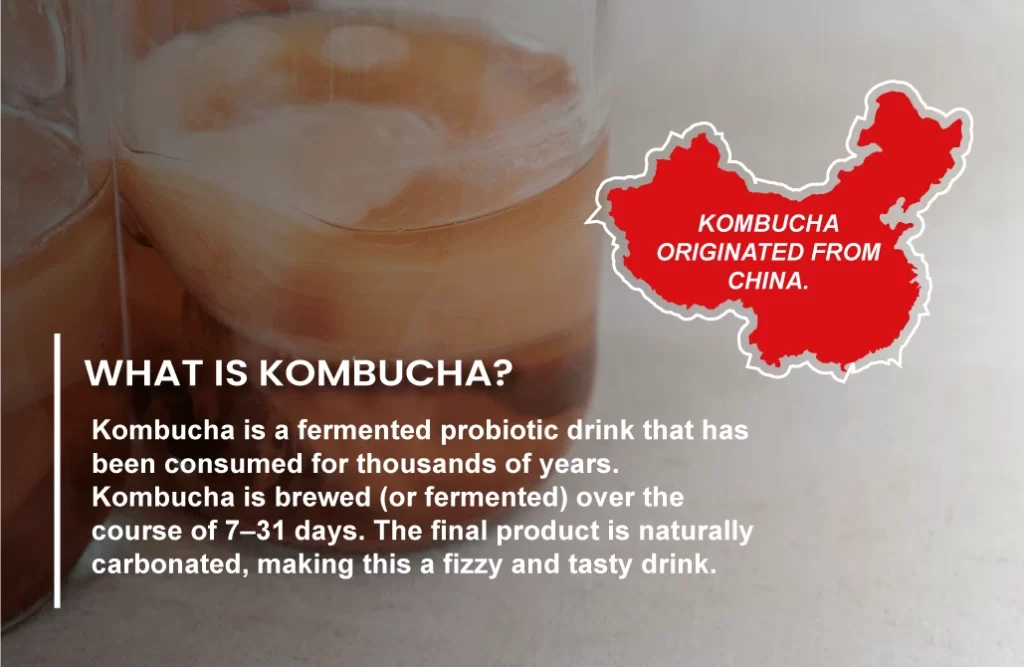 Kombucha is a fermented probiotic drink that has been consumed for thousands of years. Kombucha is brewed or fermented over the course of 7-31 days. The final product is naturally carbonated, making it fizzy and tasty drink.