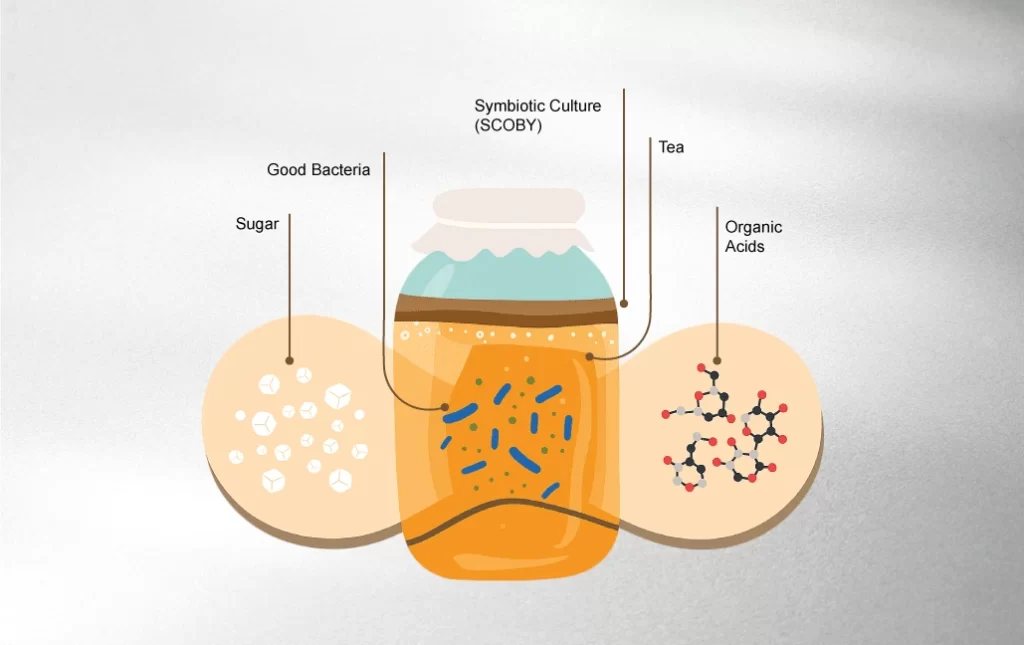 It starts with a sweetened black tea and a Symbiotic Culture of Bacteria and Yeast (SCOBY). Over time, the fermentation process turns that sugary tea into a brew rich in organic acids, antioxidants, vitamins, amino acids, and even postbiotics. What does all that mean for your skin? Some really good stuff.
